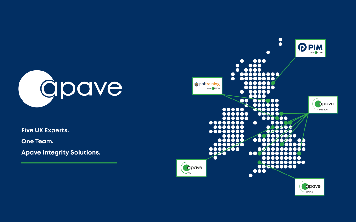 Apave Integrity Solutions brings together five Apave UK subsidiaries — PIM, Apave IRISNDT, Apave Parc, Apave TIV, and PPL Training — uniting decades of specialist experience across integrity management, inspection services, training, and laboratory services.